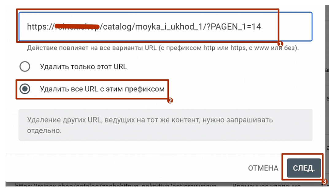 2. Удалить все url с этим префиксом - выбирайте данный вариант, если хотите удалить все варианты страницы (с префиксом http или https, с www или без).