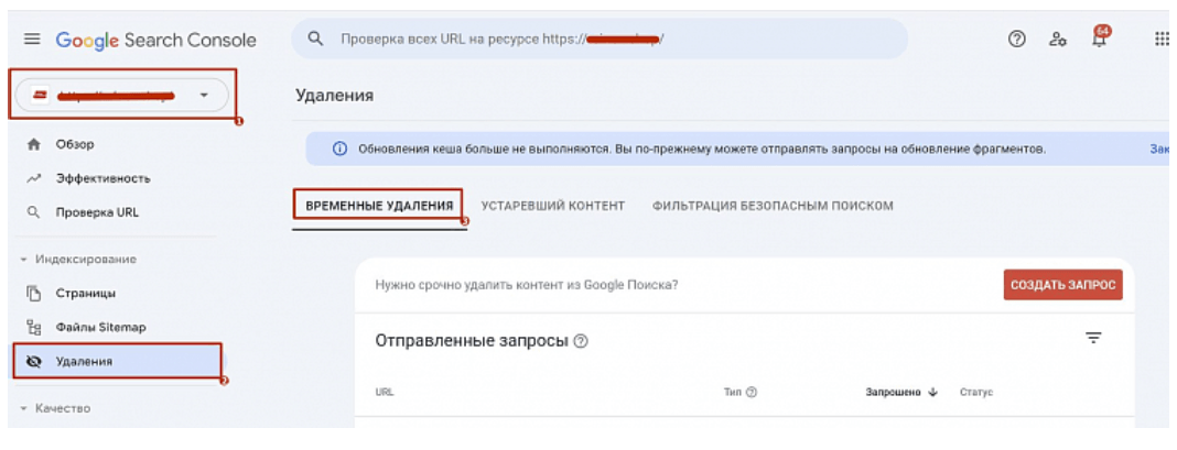 Переходим в Google Search Console → выбираем нужный сайт → удаления → временные удаления