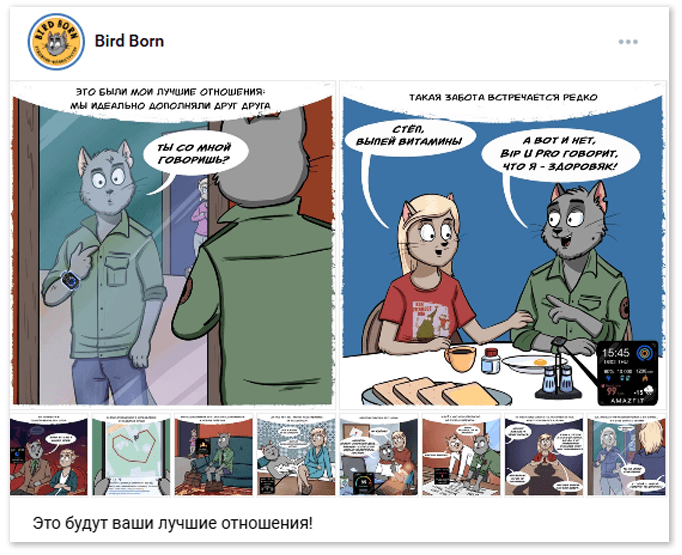 А вот еще один пример, теперь из нашей практики. Для лонча новых смарт-часов Amazfit команда коммуникационного агентства 2L привлекла популярного автора комиксов. Вместе придумали сюжеты, и художник нарисовал истории про своих, уже знакомых публике героев с участием наших часов. Он запостил новый комикс со своего аккаунта, а мы подключили таргетированную рекламу. «Разогнали» таким образом, а поскольку контент получился классным и позитивным, последовала волна естественных расшариваний. Мы получили охват почти 60 млн, который именно за счет вирусного эффекта составил 2000% относительно планируемого. Просмотров – 1,3 млн, что на 500% выше плана, и более 1600 кликов (переходов на страницы о продукте), что было выше плана на 300%. Частота запросов по модели в Яндексе за период кампании выросла с 2,5 до 4,5 тыс. в неделю. Кстати, вирусным контентом в этом кейсе стало ничто иное, как комиксы про котиков, куда же без них.