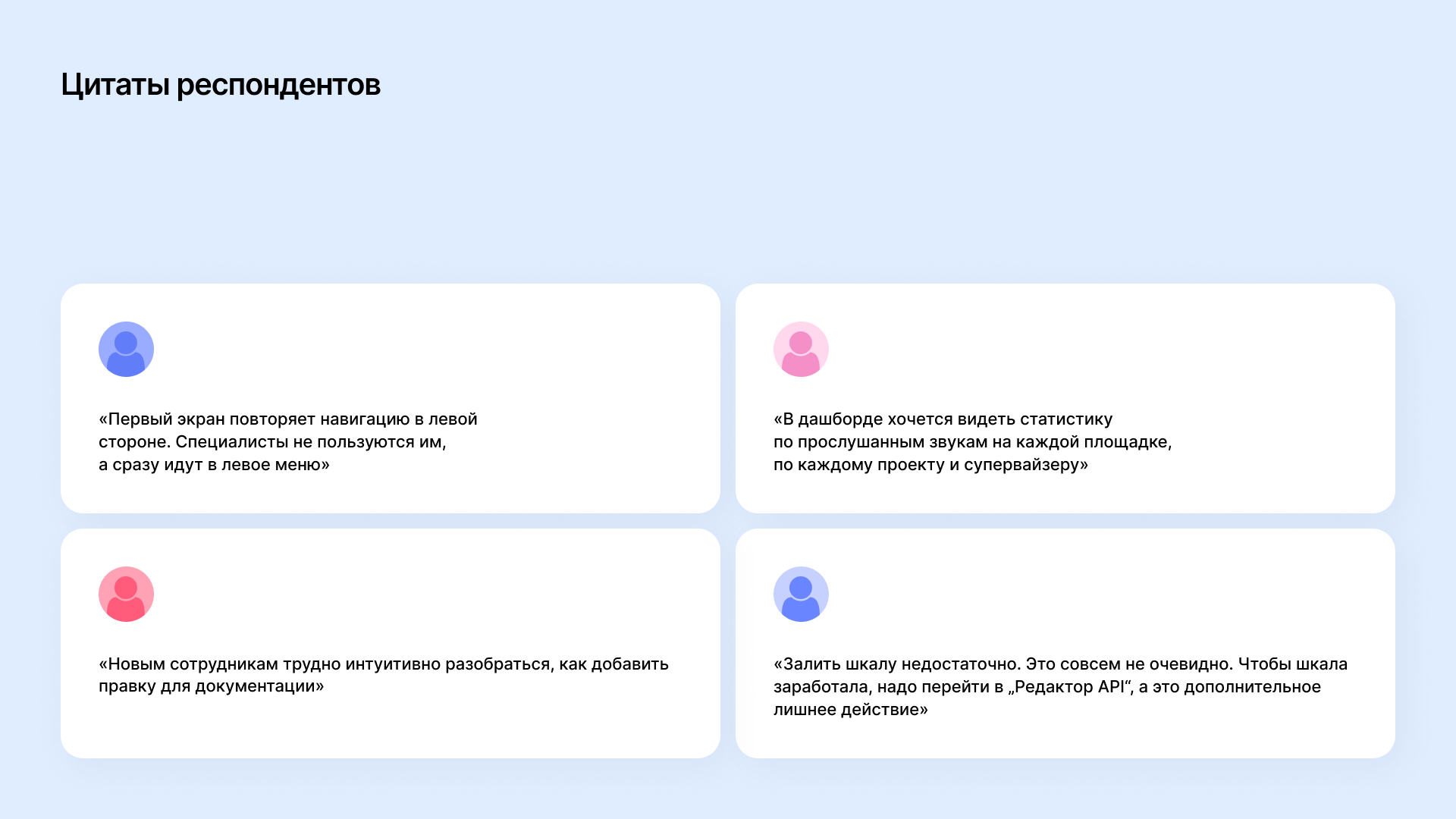 Перед редизайном QMT наша команда провела глубинные интервью с сотрудниками колл-центра: супервайзерами, администраторами, операторами и руководителями. В результате мы выявили несколько проблем: