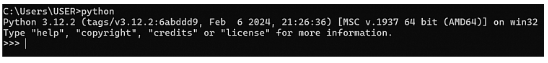 В открывшемся окне вводим команду python, после чего нам будет выдано следующее сообщение с версией:
