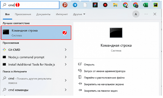 Чтобы запустить командную строку в поиске Windows набираем “cmd” или “командная” и выбираем “Командная строка”.