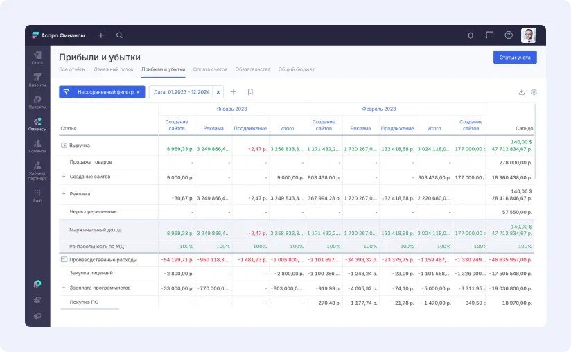 В системе финучета Аспро.Финансы удобно строить ПиУ так, чтобы у каждого направления был свой столбец — сразу видно вклад каждой статьи в результат сегмента.