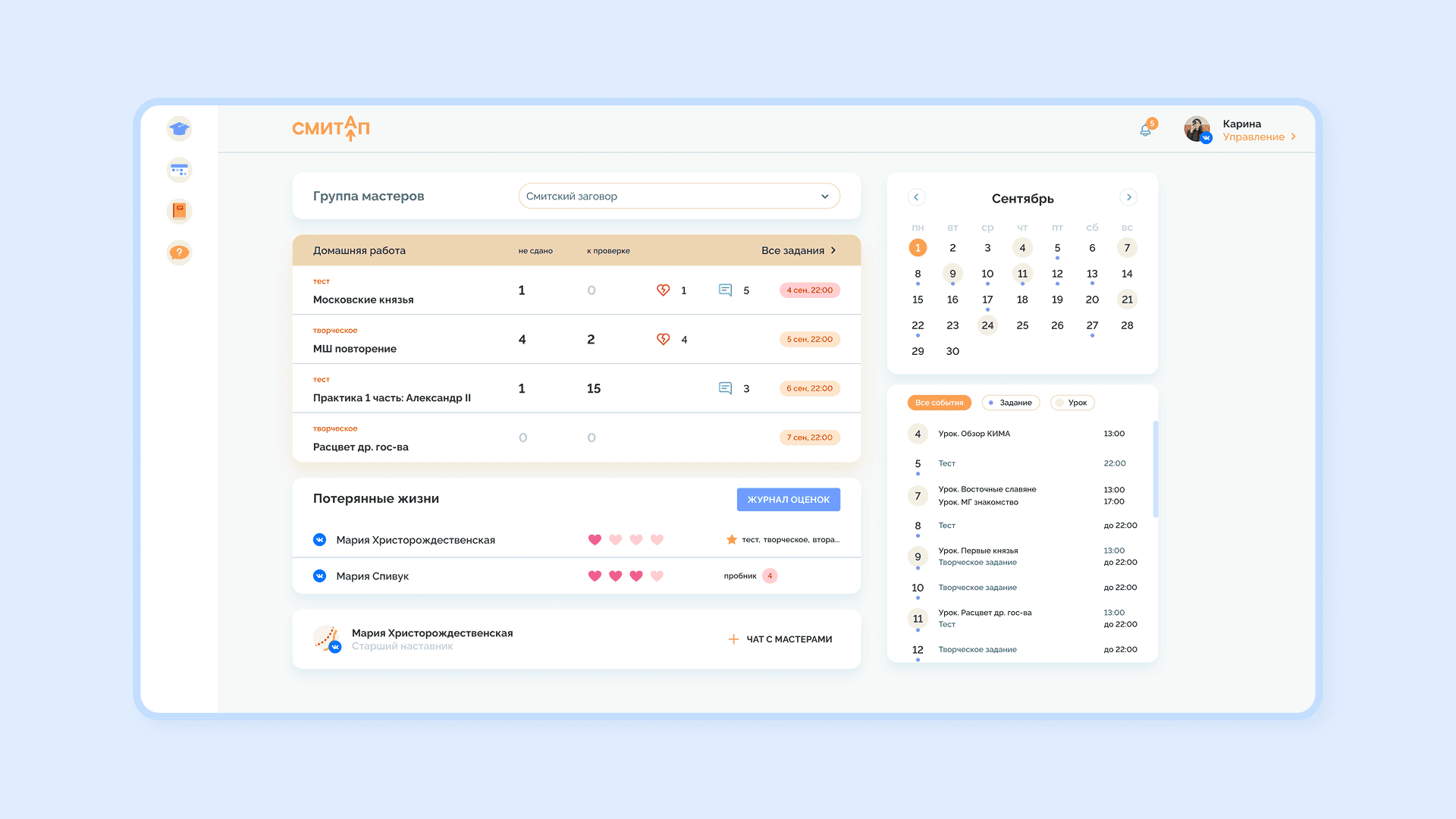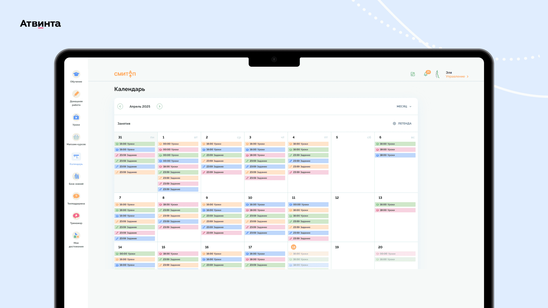 На платформе СМИТАП все построено вокруг удобства студента: дашборд показывает дедлайны, прогресс и ближайший урок. Есть календарь, статистика и мотивационные элементы. Все это снижает напряжение и направляет внимание в нужную сторону.