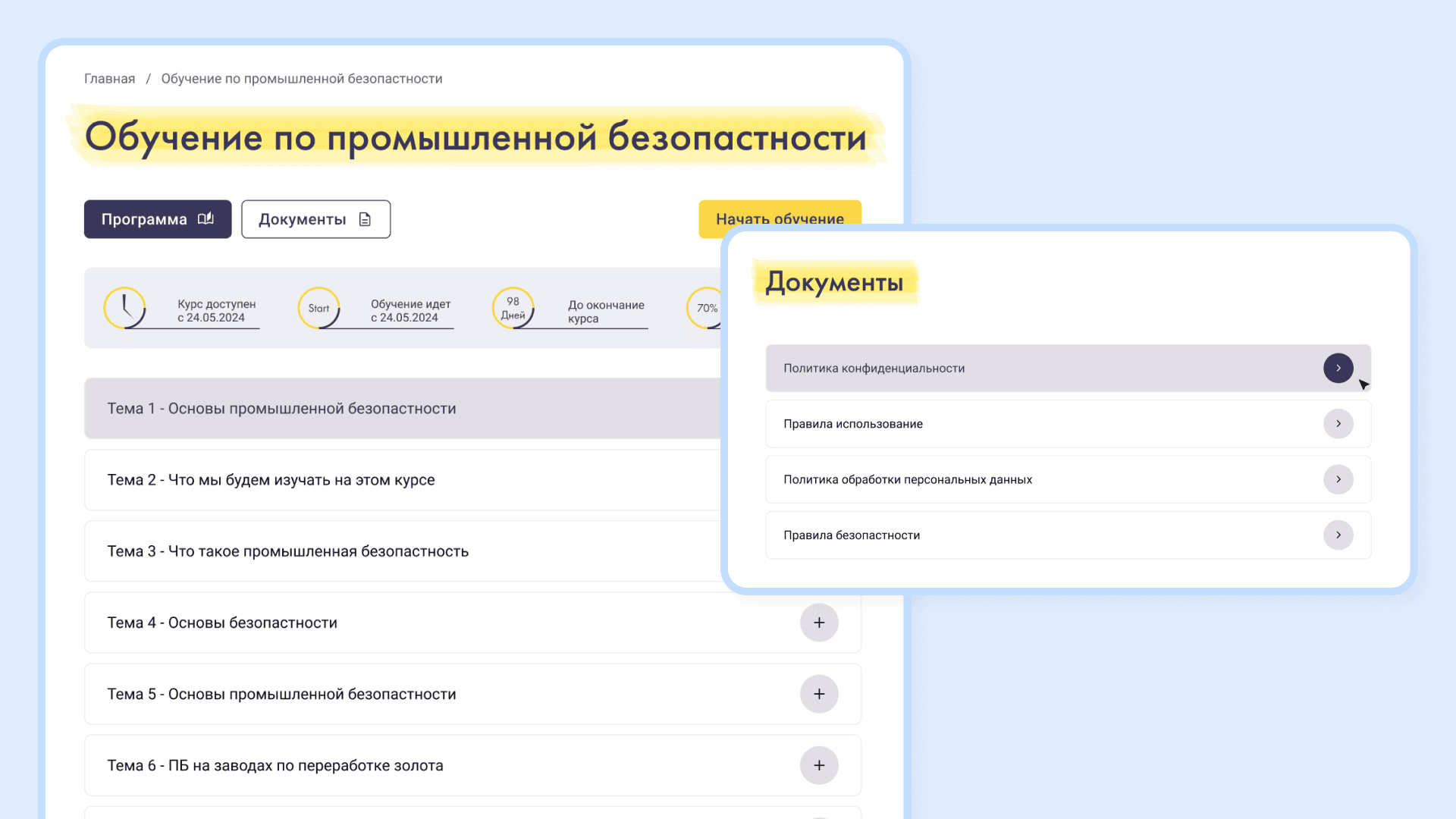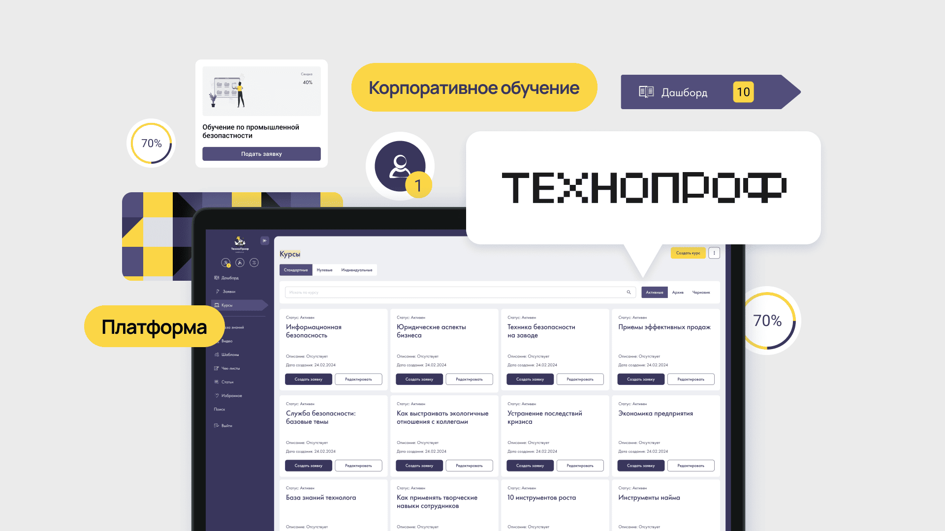 В корпоративной системе «ТехноПроф Академия» сотрудник видит курсы и необходимые документы, администратор управляет заявками, а контрагент следит за прогрессом. Такой подход экономит время и делает работу с платформой прозрачной.