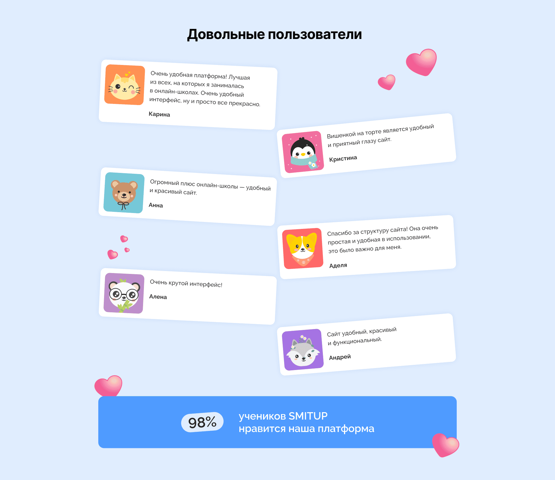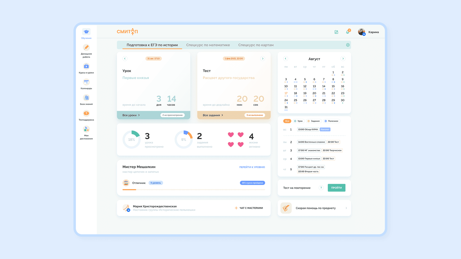 Например, для образовательной платформы СМИТАП мы сделали дашборд ученика, на котором собраны ключевые блоки в минималистичном и игровом дизайне: