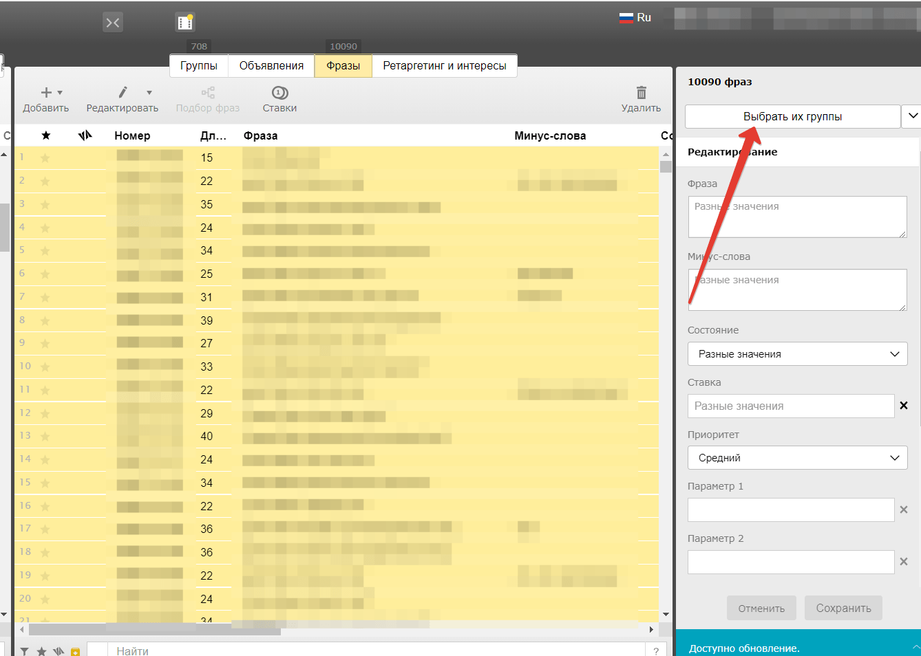 Для этого пользуемся звёздочками. По шагам выделяем все группы всех кампаний и переходим в ключевые фразы. Выделяем их все и жмём выбрать их группы.