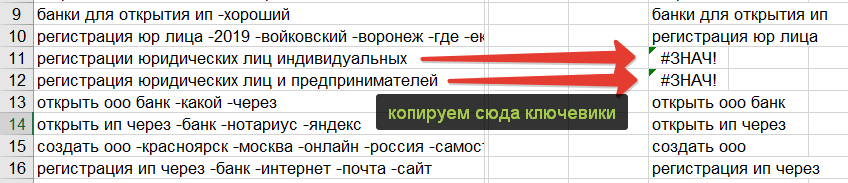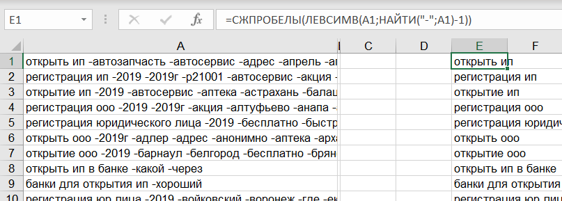 Идём в соседнюю ячейку и прописываем простую формулу. Пример за условие, что первое слово из списка ключевых фраз находится в ячейке А1, то есть в самом верхнем левом углу.