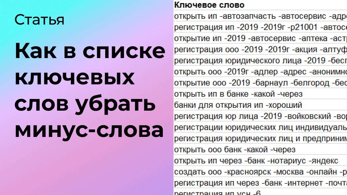 Ручное удаление минус-слов – это долго и не эффективно, особенно когда речь идет о работе с большими базами данных. Но формула, приведенная в статье, позволит автоматизировать эту задачу. В результате вы за считаные секунды сможете удалить лишнее из списка ключевых фраз.