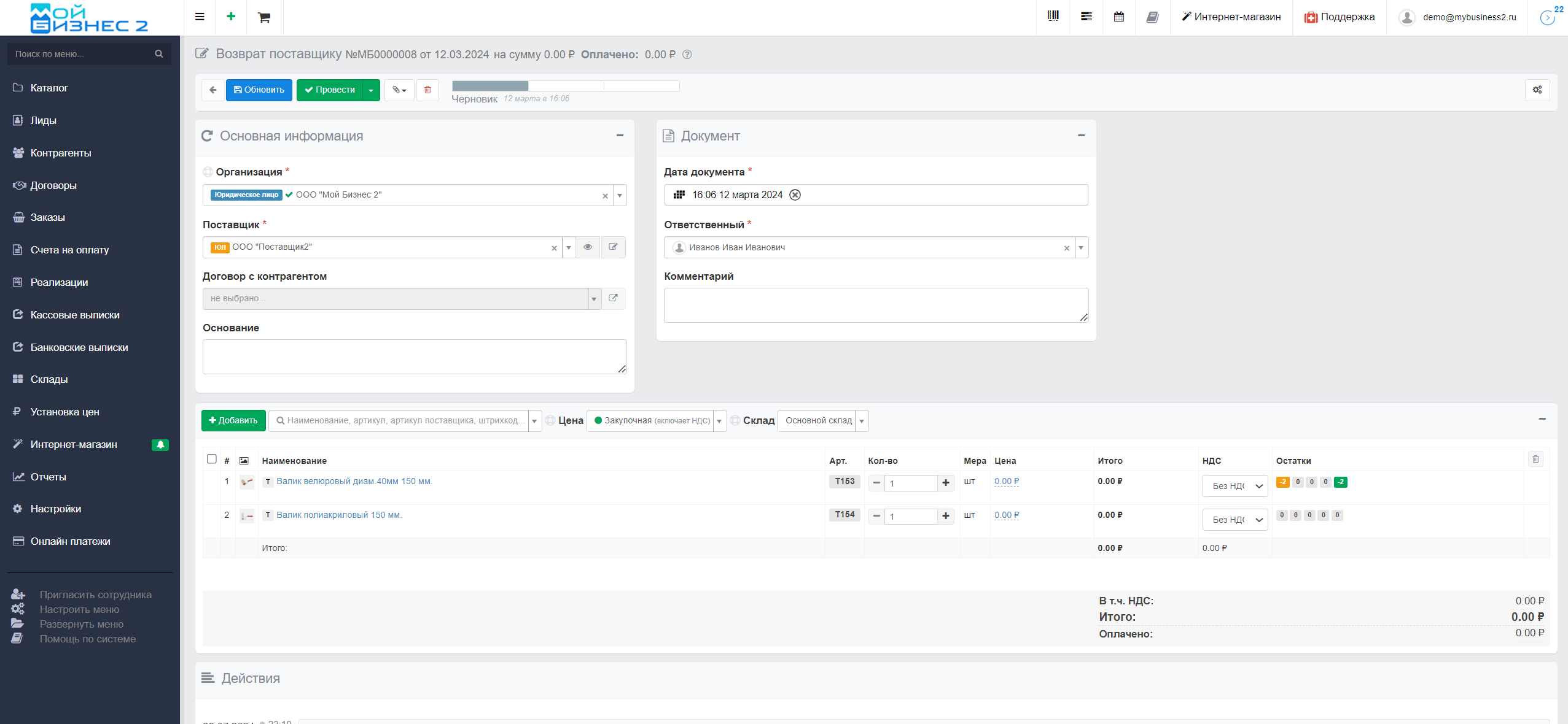 Документ "Возврат поставщику" также влияет на остаток. Он оформляется, к примеру, когда на склад прибыл бракованный или не отвечающий требованиям товар. Мы подготовили статью о том, как применять данный документ в нашей системе.