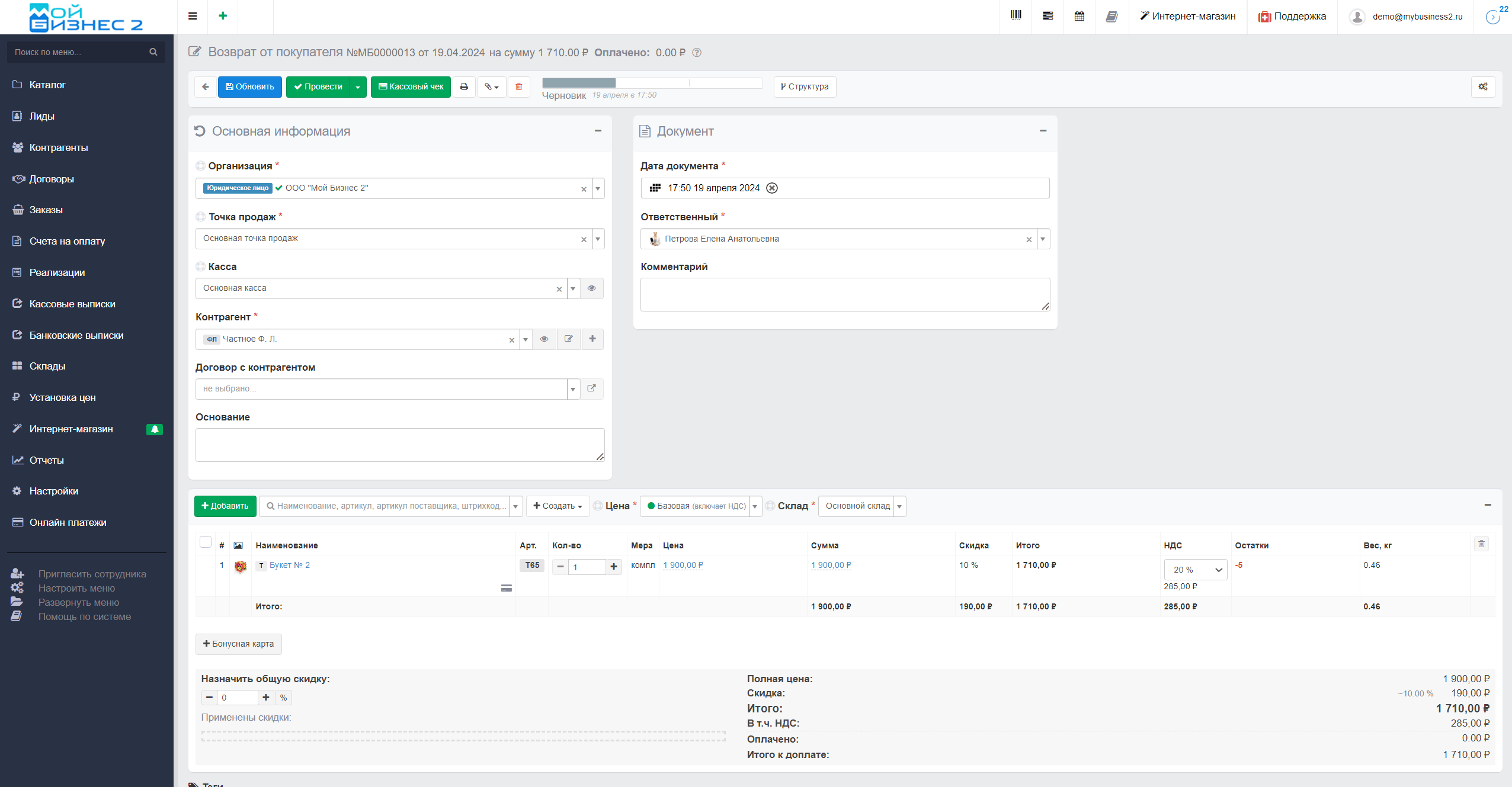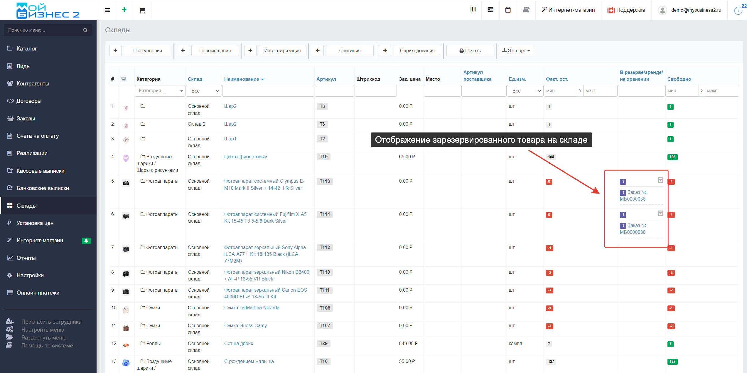 Повлиять на остаток складского товара можно посредством документа "Возврат от покупателя". При помощи этого документа товар снова вводится в оборот и отображается дополнительными единицами на складе. Подробнее об этом документе в нашей статье.