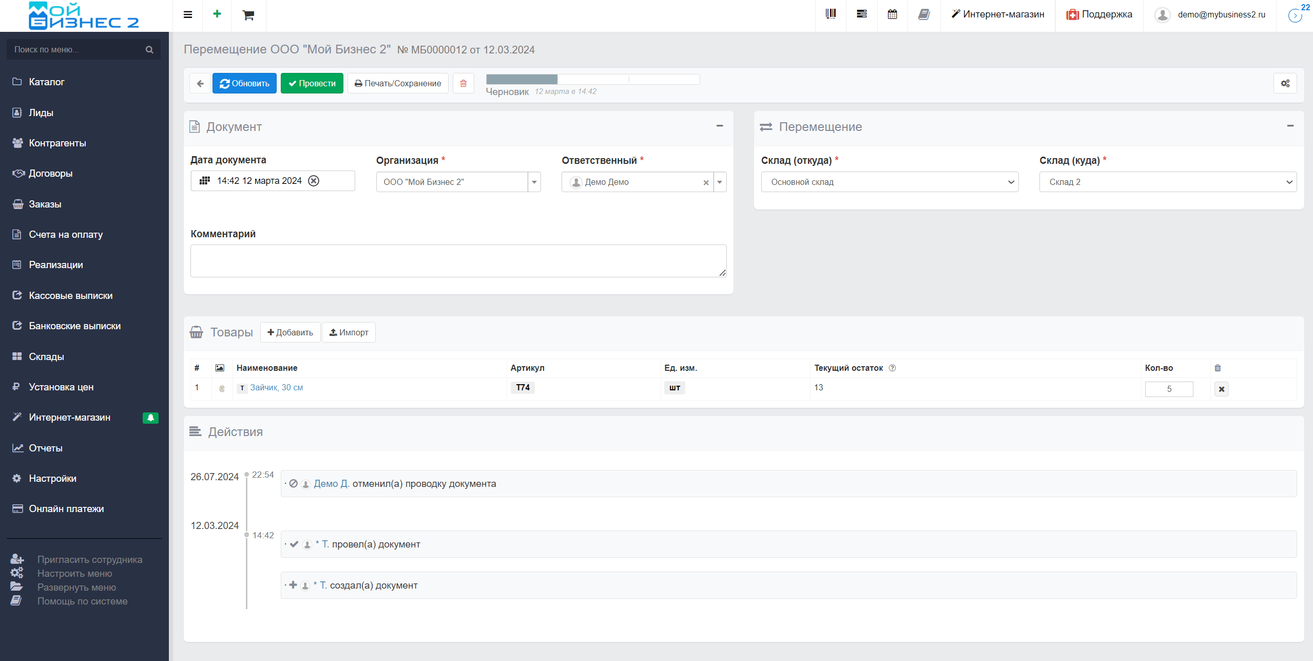 Документ "Перемещение" позволяет переносить товар между разными складами, если в системе их несколько. Подробнее о документе читайте в другой статье.