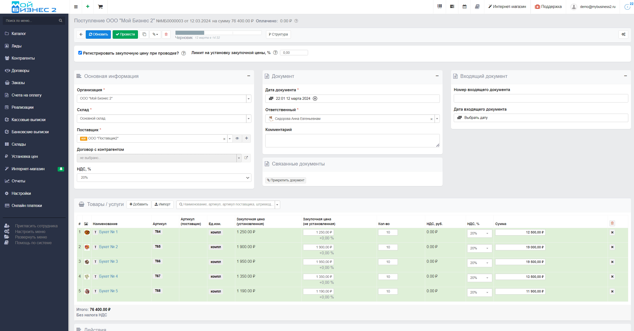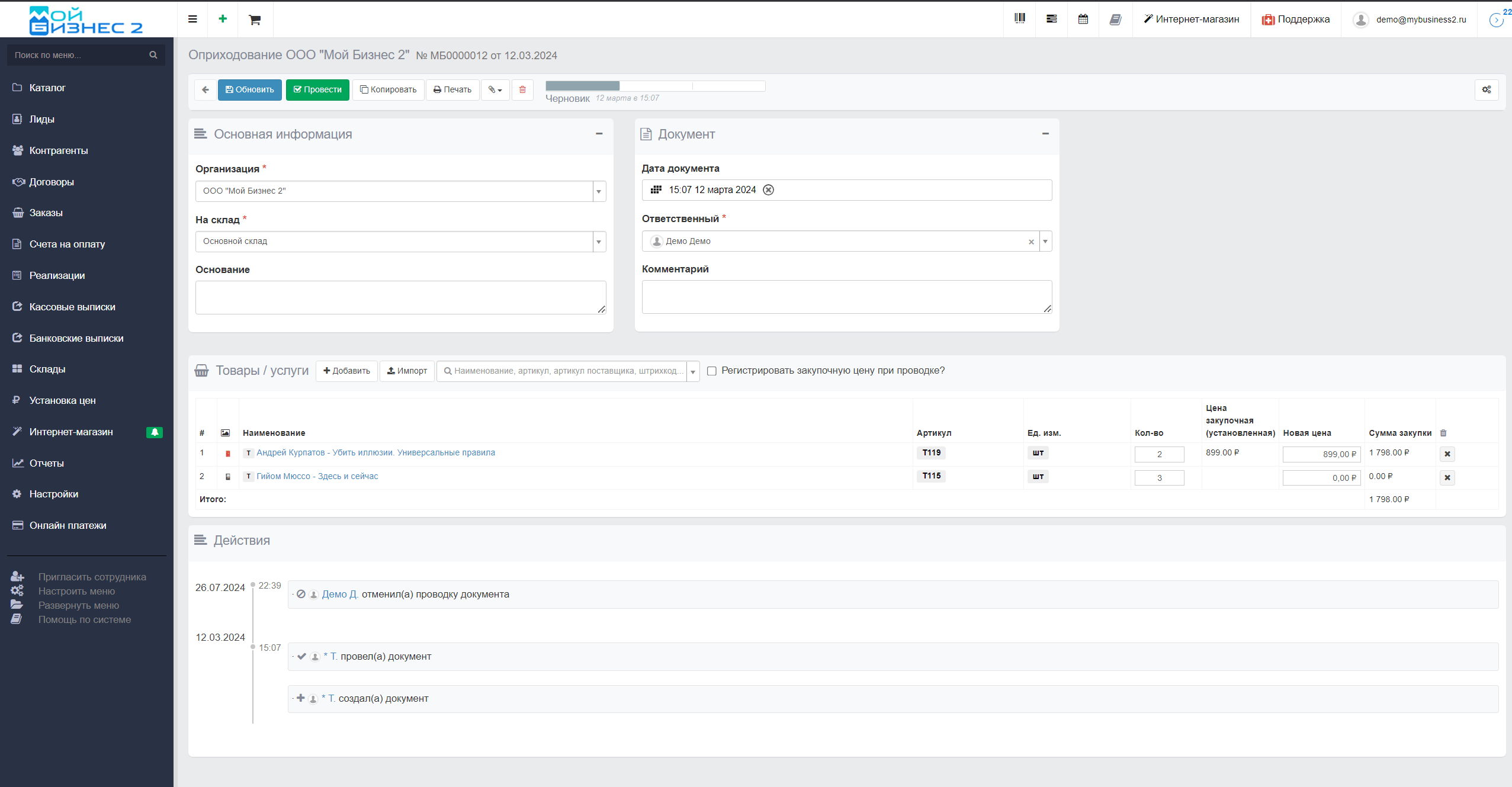Документ "Поступление", в целом, выполняет аналогичную функцию, что и оприходование, но в системе МойБизнес2 он имеет отличие в том, что с помощью него оформляют закупку товара именно у поставщика. Здесь можно сразу установить закупочную цену или осуществить импорт товаров. О том, как использовать поступление, можно ознакомиться в следующей статье.