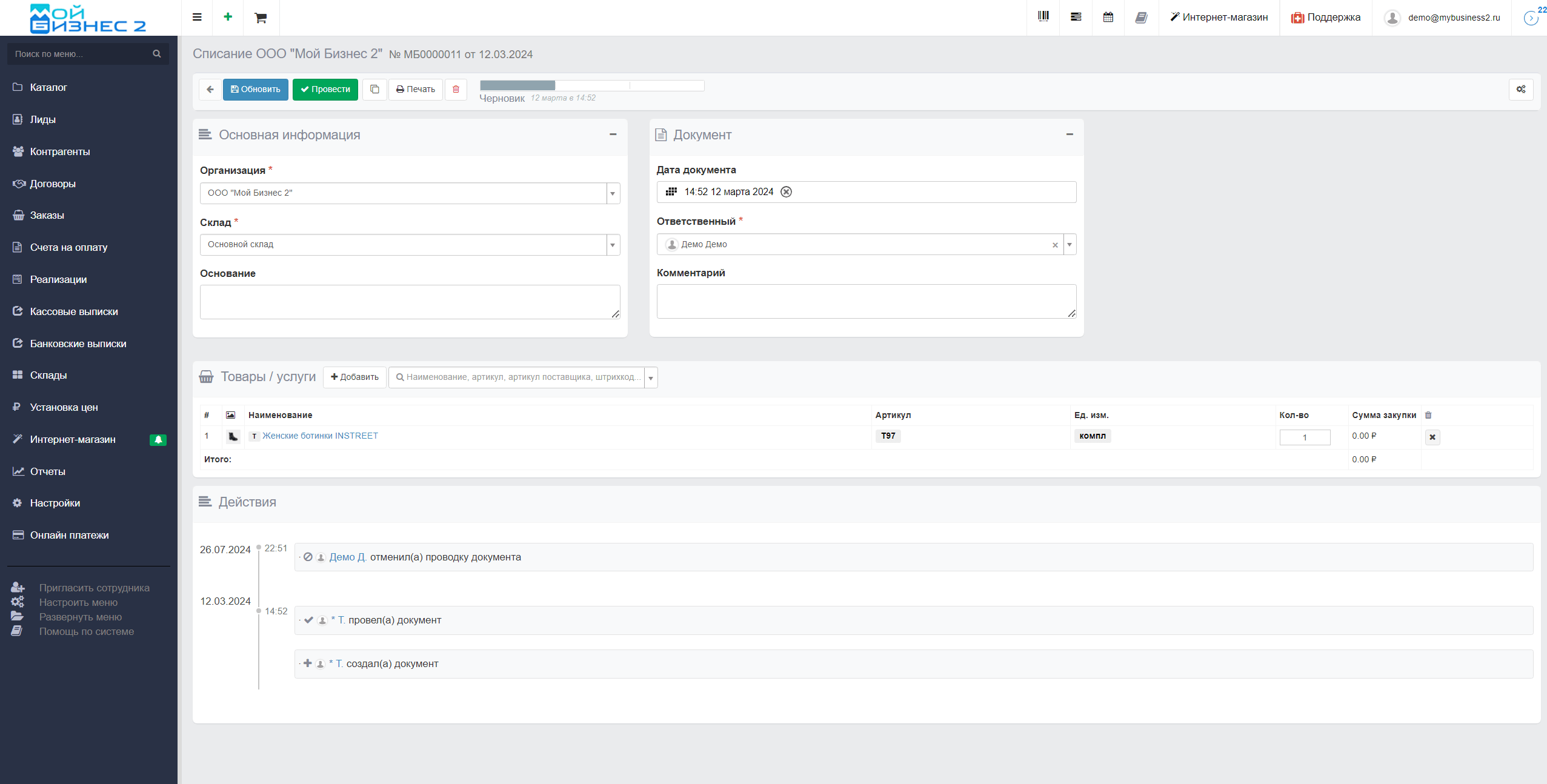 Документ "Списание" позволяет списать товар со склада, например, по причине брака, порчи и т.д. О том, как списать товар в МойБизнес2, предлагаем ознакомиться в статье.