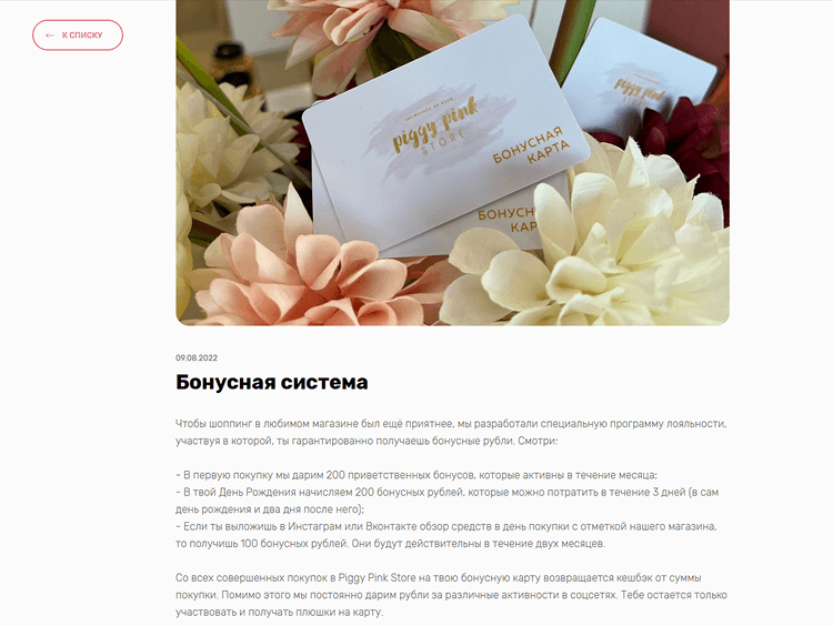 Клиенты получают бонусные баллы за покупки и обменивают на скидки. Например, интернет-магазин Piggy Pink позволяет накапливать бонусные рубли и оплачивать ими до 50% стоимости товаров.