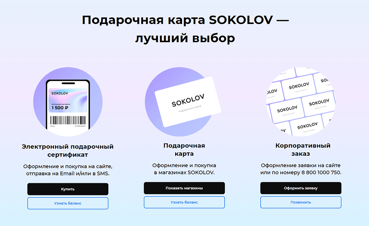 Позволяют клиентам делать подарки и мотивируют на новые покупки. Ювелирная компания SOKOLOV предлагает подарочные карты на выбор: электронные, на покупки в магазинах и для корпоративных заказов.