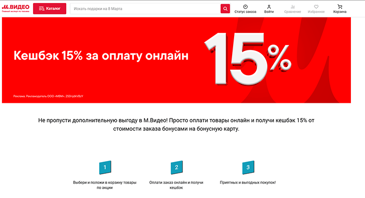 Возвращается часть потраченной суммы в виде баллов или денег. Например, «М.Видео» начисляет бонусы за покупки, которыми можно оплатить до 50% следующего заказа.
