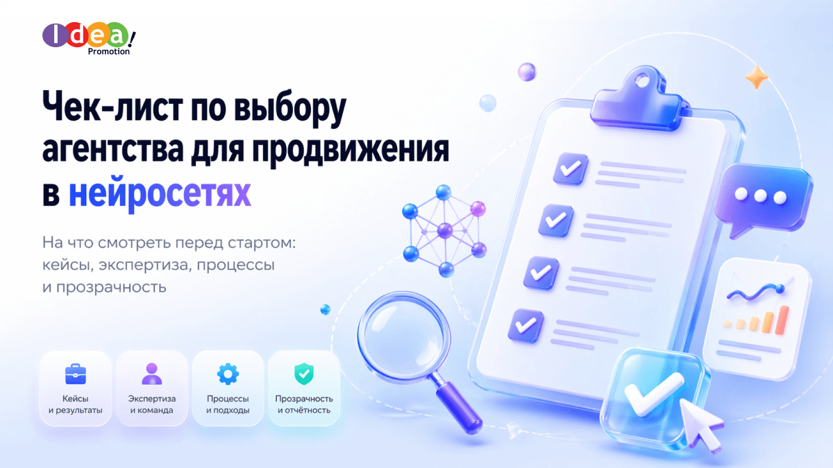 Рейтинги 2026 года отдельно фиксируют этот параметр. Idea Promotion входит в топ агентств по продвижению через нейросети, что при прочих равных добавляет вес при сравнении подрядчиков, претендующих на звание лучшего агентства по нейросетям.
