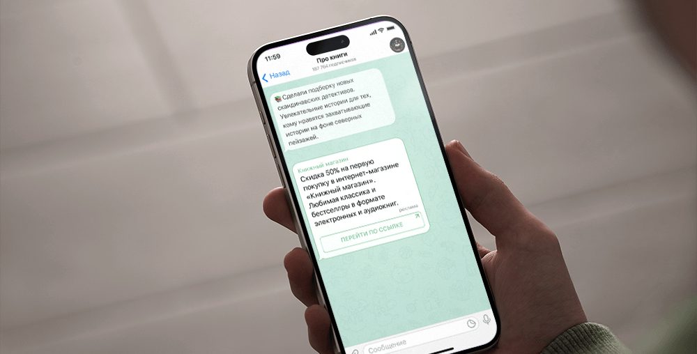 В этом случае ваше объявление также будет показываться в тематических каналах, смежных с вашей нишей, однако не в виде поста. В Telegram Ads сегодня доступен только текстовый формат с кнопкой перехода, которая может вести на сайт или в ваш канал.