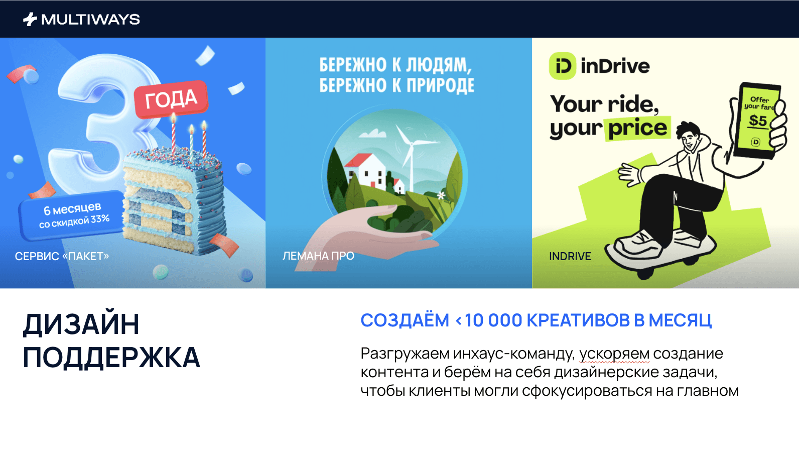 Аутсорс дизайнерских задач в агентство позволяет выпускать сложные и масштабные проекты без собственной команды. Также в агентство можно обратиться за масштабными изменениями вроде большого ребрендинга, на которой у инхаус-команды может не хватить идей и навыков. Потребуется время, чтобы ввести внешних специалистов в курс дела, оговорить все детали сотрудничества и согласовать договоры, но результат обычно стоит того — агентство берёт на себя и подбор подходящих специалистов, и креативные идеи, и их реализацию. Помимо работы по проектным договорам, Multiways предлагает услугу дизайн-поддержки — полного сопровождения проекта на всех этапах в течение оговорённого срока. Подробнее о дизайн-поддержке читайте в нашей статье.