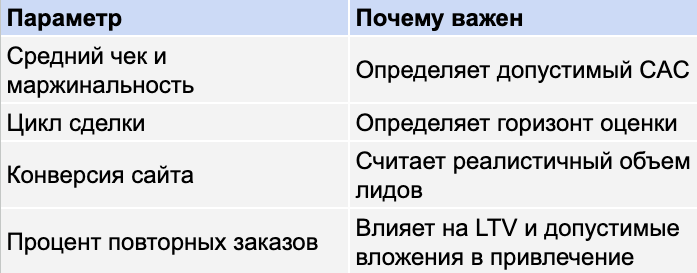 На первой встрече мы всегда спрашиваем: какой у вас средний чек, сколько длится сделка, сколько лидов нужно для одного договора. Без этого мы не можем сказать, сработает ли вообще тот бюджет, который клиент готов вложить. Лучше сказать это на берегу, чем молчать и списывать потом на "сложную нишу".