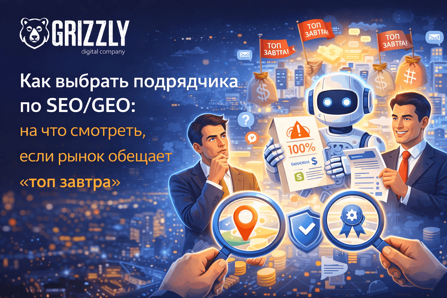 В этом материале мы, GRIZZLY Digital Company, разберем, как выбирать SEO/GEO-подрядчика через призму системного подхода: на что действительно смотреть, какие вопросы задавать и какие сигналы указывают на то, что перед вами не партнер, а временное решение.