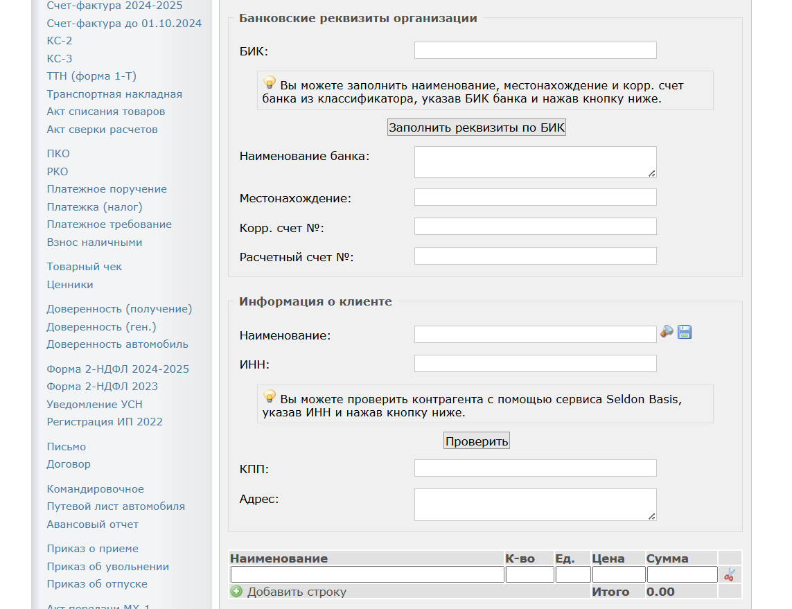 Работает с первичными документами: счетами, актами, коммерческими предложениями. Не подставляет реквизиты по ИНН автоматически, но позволяет создать собственный справочник контрагентов.