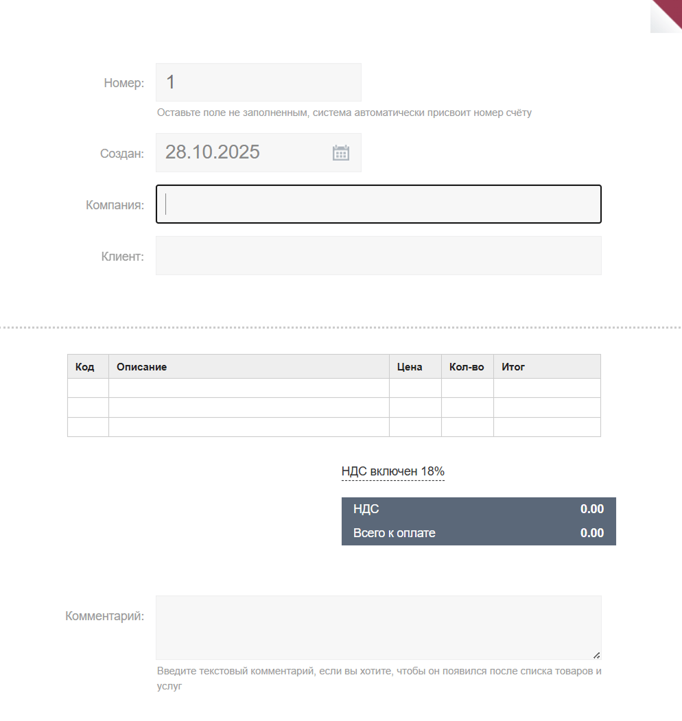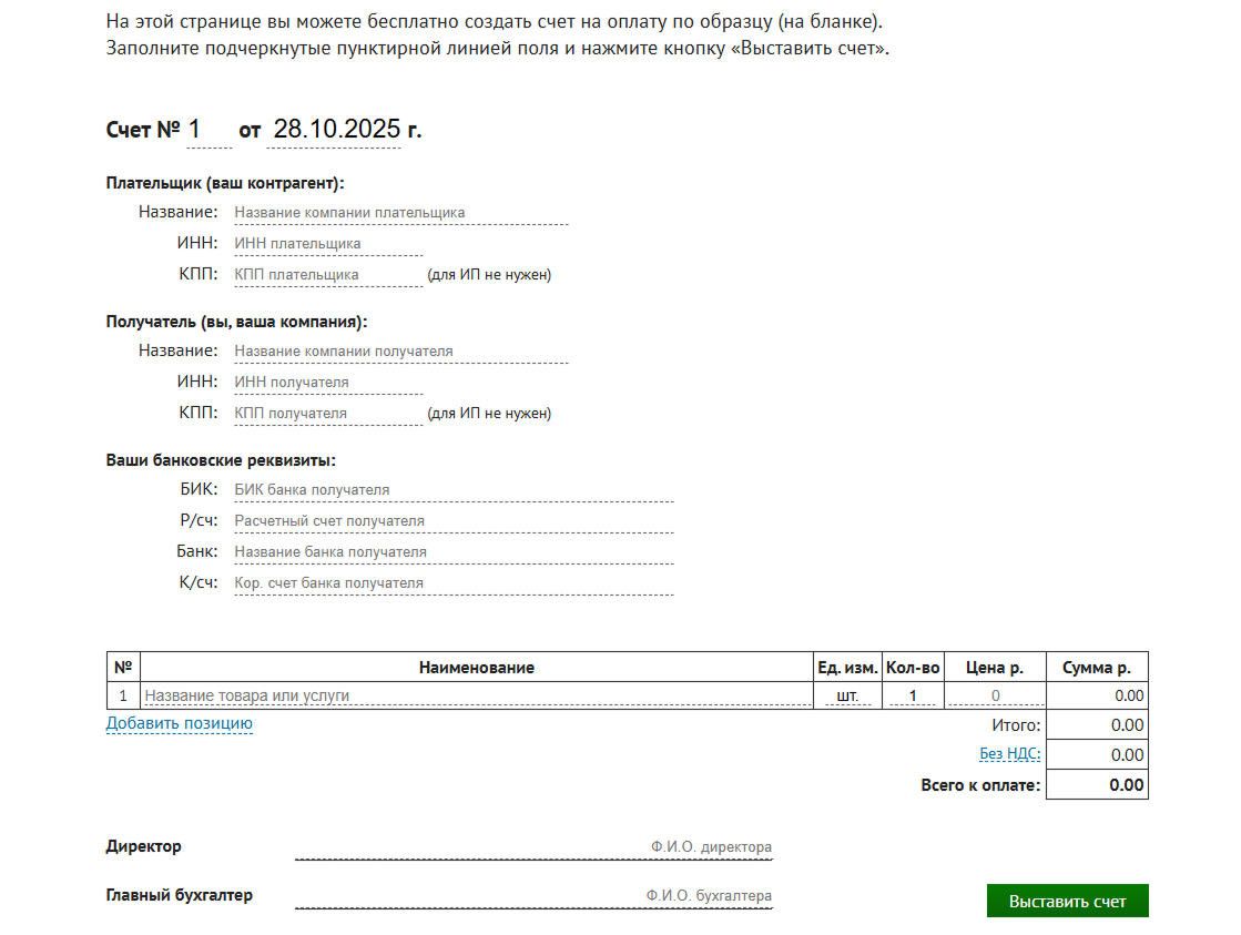 Онлайн-сервис, который позволяет формировать счета без регистрации и установки программ. В нем предприниматель вручную вписывает все данные продавца и покупателя, вносит стоимость и количество товаров или услуг. После этого платформа автоматически формирует файл со счетом, который можно скачать в формате PDF, распечатать или отправить клиенту по электронной почте.