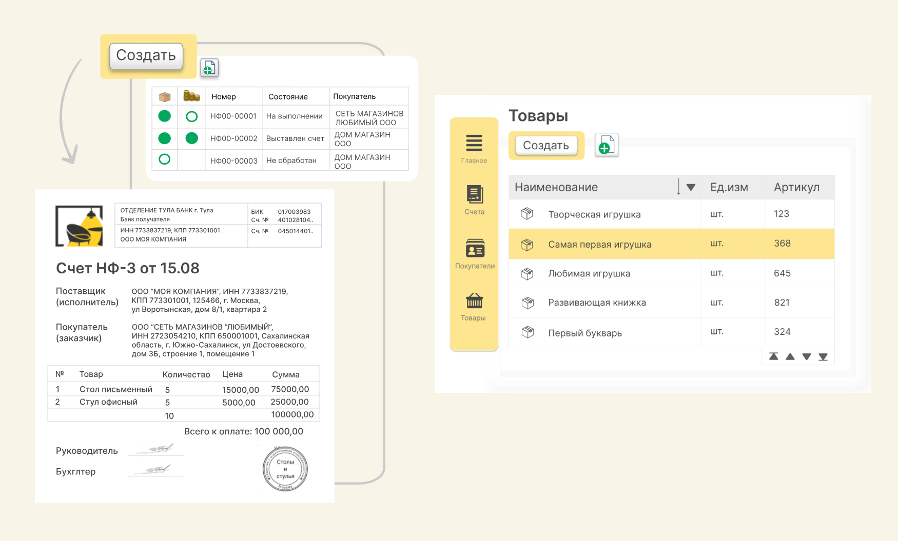 Позволяет выставлять счета и формировать связанные документы. После создания счета система также подготавливает товарную накладную, счет-фактуру и акт.