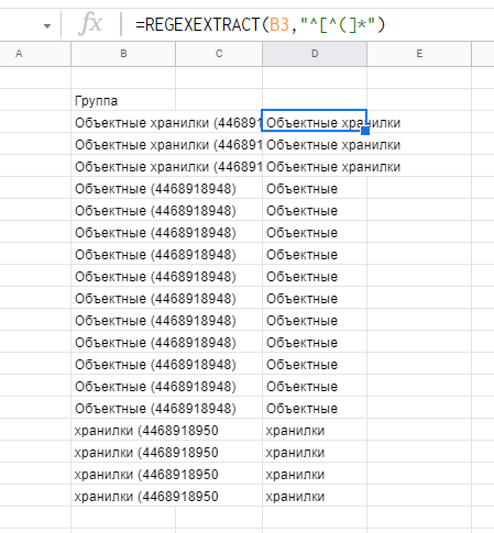 REGEXEXTRACT — это стандартная функция для извлечения данных с помощью регулярного выражения.B3 — ячейка с текстом^[^(]* — само регулярное выражение, которое говорит следующее.