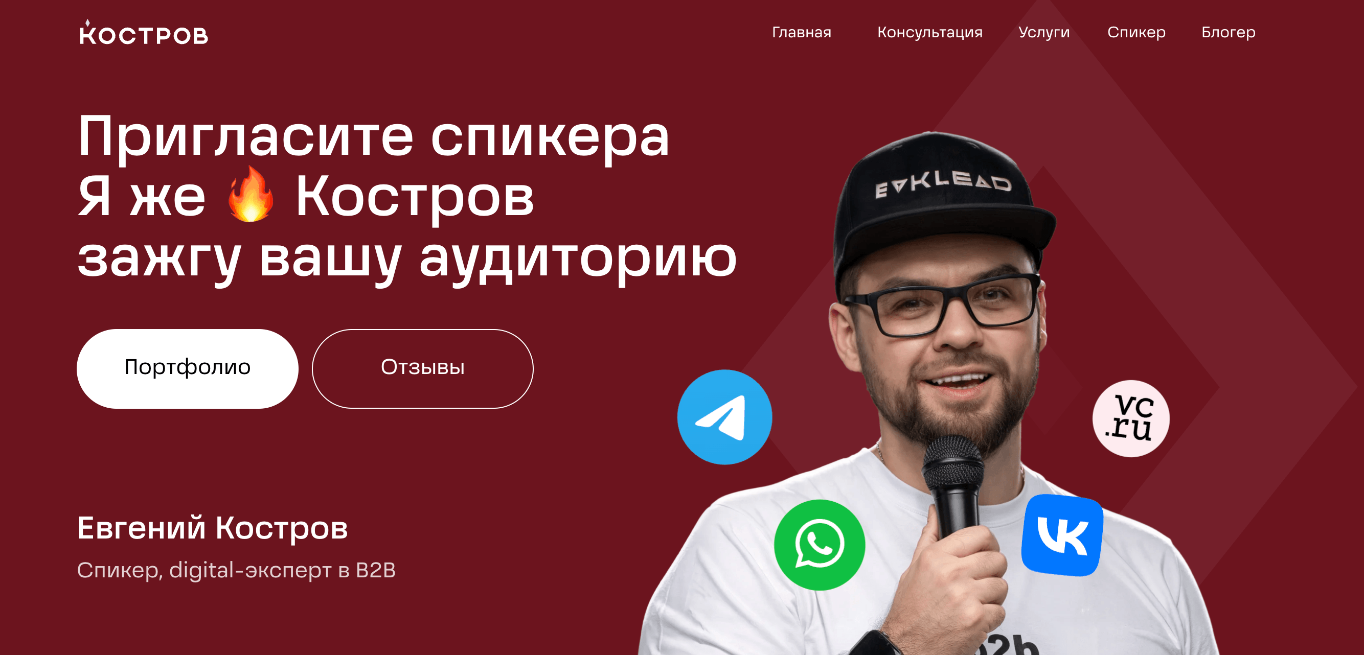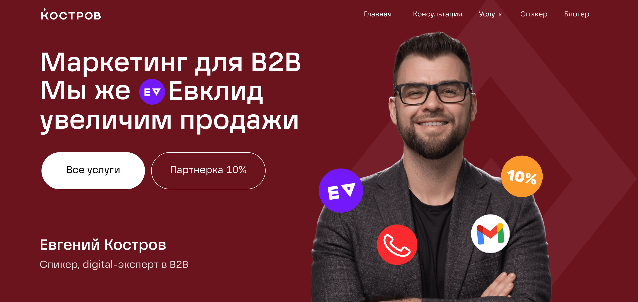 В концепции я увидел, что играю несколько профессиональных ролей. Это руководитель агентства, спикер, блогер и digital-эксперт, а также еще Евклид, как агентство, предлагает услуги. Все это стало основой для разделения сайта на отдельные страницы.