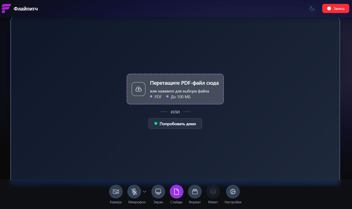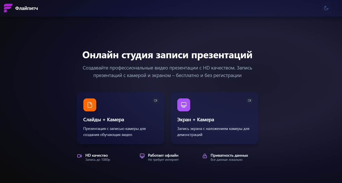 Флайпитч работает с учётом российских условий, видео остаётся локально, не требует установки, не улетает на зарубежные серверы, полностью безопасно и удобно для рабочих презентаций и продаж. Сервис доступен бесплатно и прямо в браузере, без сложных настроек, VPN и подписок.