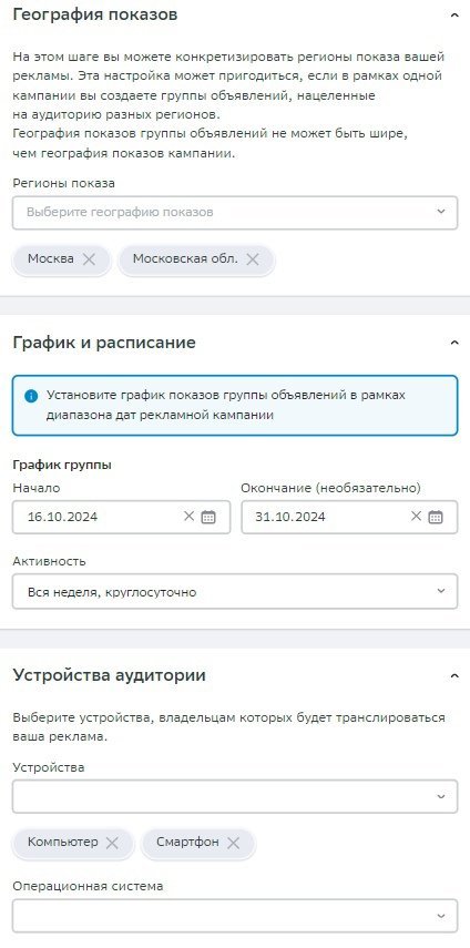 Повторяем заполнение граф «География», «График и расписание», плюс добавляется поле «Устройство» — мобильное или десктоп.
