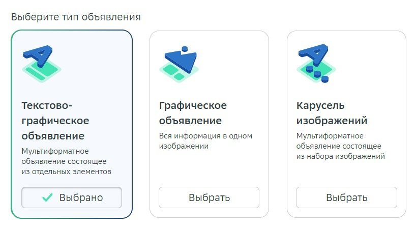 В блоке нужно вписать название объявление и выбрать, как оно будет отображаться — в формате изображение с текстом, только изображение или карусель.
