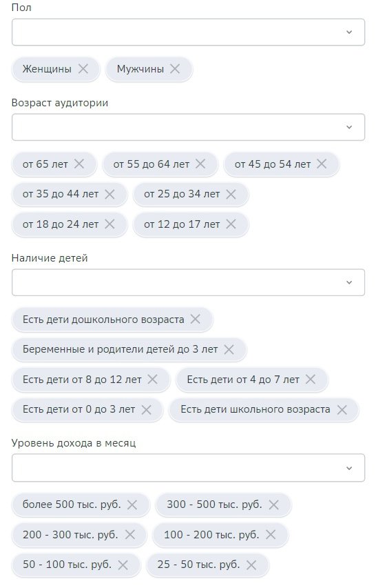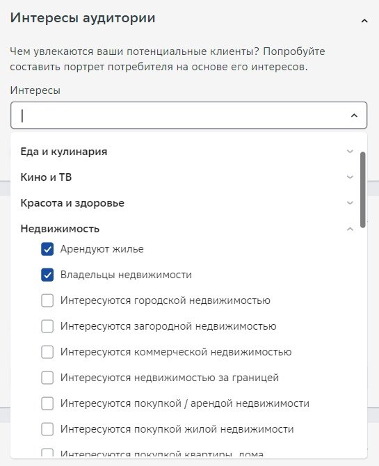 Очень много групп интересов и они суммируются. Каждая группа интересов имеет выпадающий список, который уточняет параметры. Например: