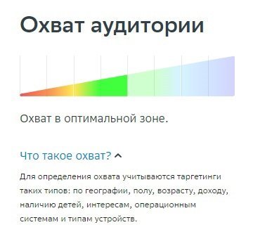 Справа видим прогнозатор — он анализирует охват аудитории исходя из выбранных таргетингов и дает рекомендации по объему.