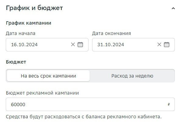 Выставляем дату начала и окончания показа РК, а также как будет расходоваться бюджет — указанной суммы должно хватить на неделю или на весь указанный срок.