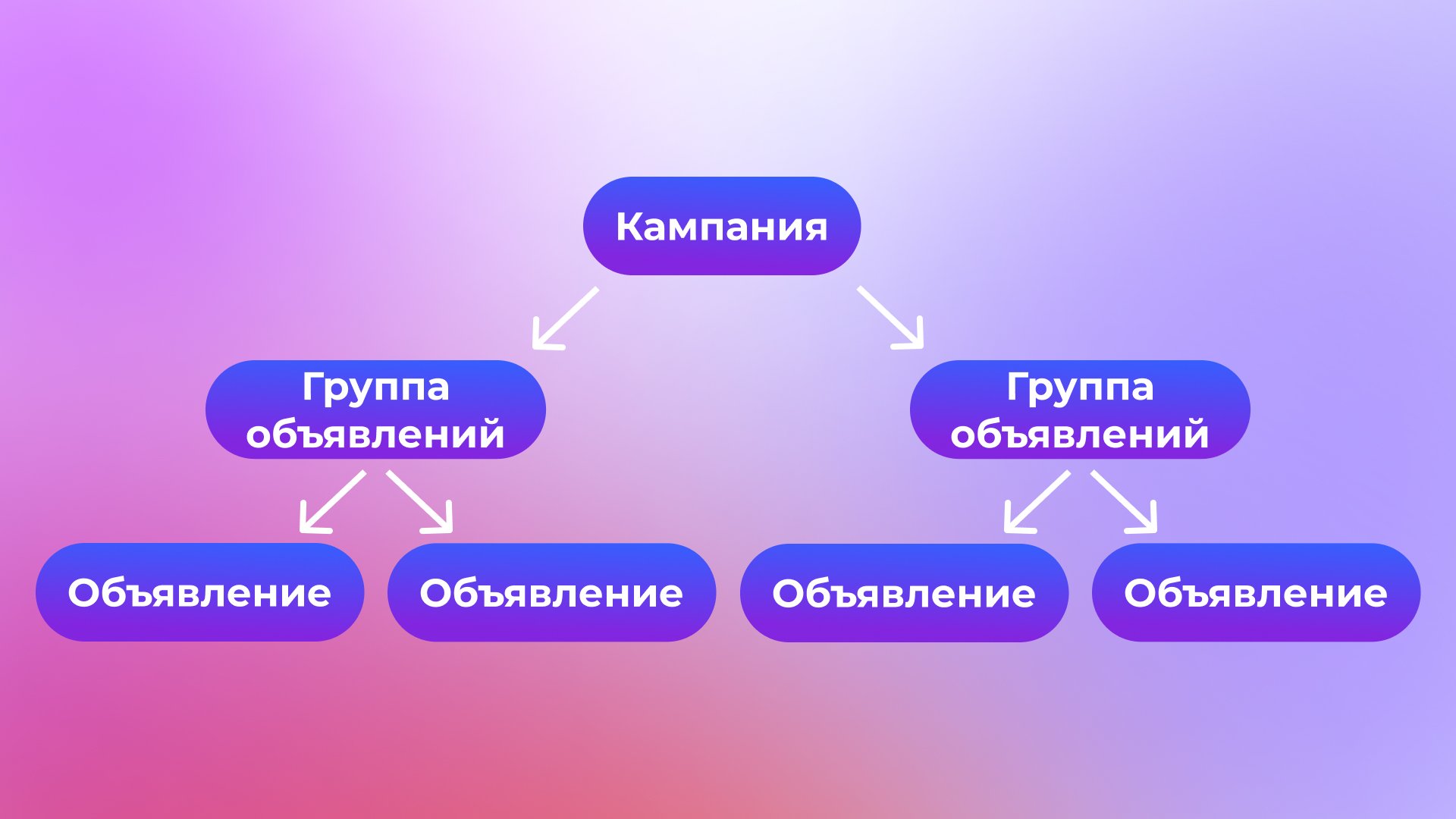 Каждый раздел может ветвиться: кампании могут включать несколько групп объявлений, а каждая группа объявлений — несколько объявлений.
