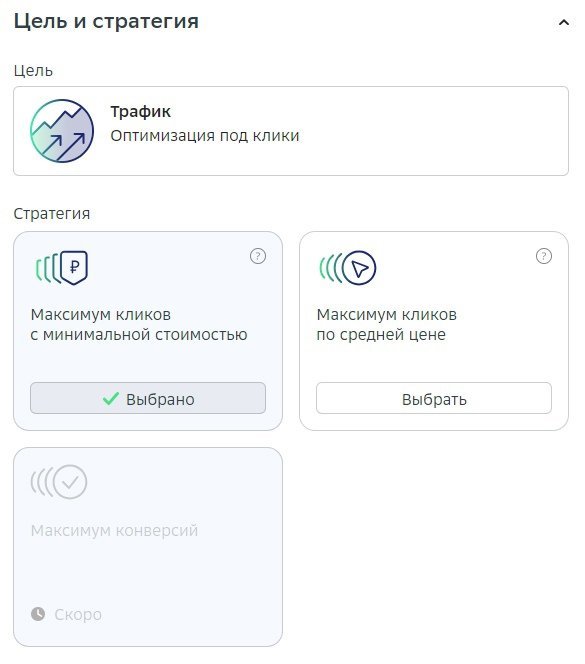 Даем кампании имя. Первый экран позволяет выбрать цель и стратегию. Можно выбрать: