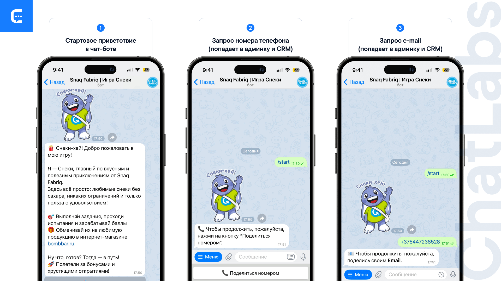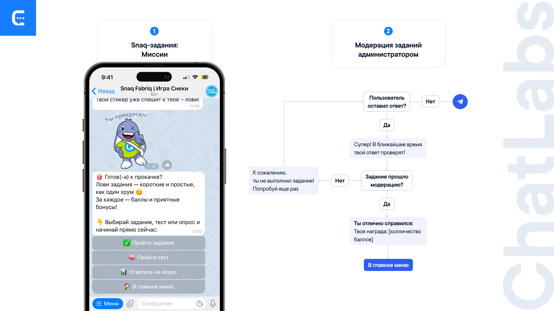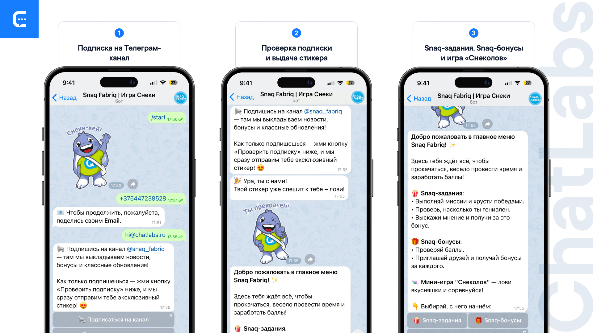 Для Snaq Fabriq разработчики ChatLabs создали программу лояльности с геймификацией в Телеграм. Технически это связка Телеграм-бота и мини-приложения, которая позволяет закрыть сразу несколько задач бизнеса: сбор данных аудитории, увеличение подписчиков, повышение продаж, получение отзывов и обратной связи. Вместо Телеграма можно использовать отечественные мессенджеры: MAX, VKontakte.