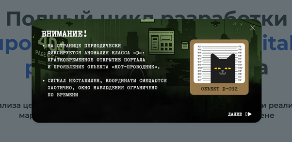Для спецпроекта было создано отдельное промо в соцсетях, которое полностью погружает человека в историю. Но не вся аудитория приходит оттуда, поэтому для тех, кто попал на сайт с внешних источников, мы дали краткое объяснение в начале. То есть человек может пройти историю, не понимая всего лора, и получить 100% впечатления, а может быть знать все тайные подсказки и погрузиться на 200%.