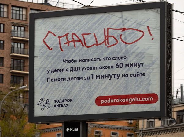 Если хотите получить виральный охват проекта, чтобы СМИ подхватили историю, проще всего это сделать через социальную значимость проекта. Самый массовый пример — благотворительность. Скорее всего, вы видели подобный баннер в своём городе, где к слову «спасибо» не детская надпись, а шрифт, специально разработанный агентством.