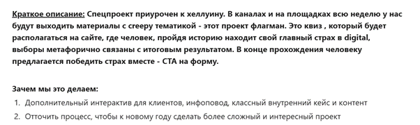 Каждый спецпроект должен иметь связь с тем, что важно вашему бизнесу. Большой плюс спецпроектов в том, что здесь можно немного отойти от привычного TOV (tone of voice) и сделать что-то, скажем так, более претенциозное. Но идея должна быть стратегически значимой: демонстрация продукта, формирование репутации или укрепление доверия. Если идея «не конвертится» в бизнес-цель, она только тратит ресурсы.