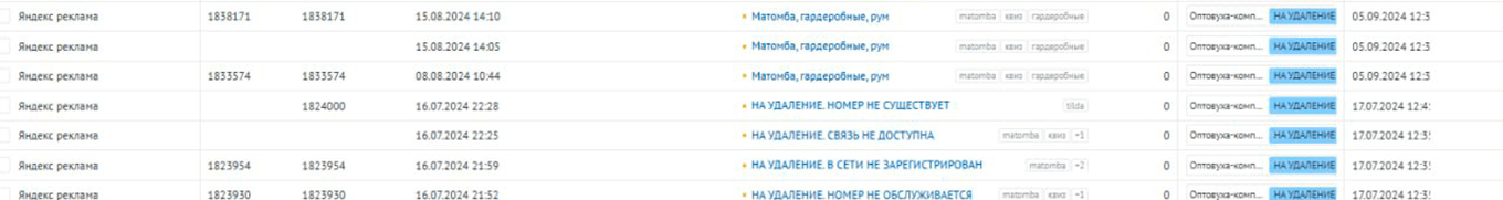 Вот один из наших кейсов — производитель элитной мебели. Мы приводим скрин из CRM-системы, где указано, откуда пришел пользователь (Яндекс Директ), когда и почему номер подлежит удалению: чаще всего номер не существует, недоступен или пользователь его вовсе не оставлял.