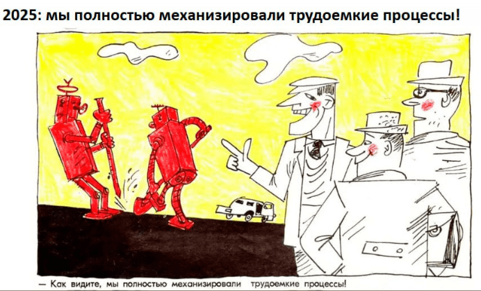 Это не шутка. Однажды на форуме в Ярославле на сцену вывели робота Бориса, который танцевал, разговаривал с ведущим, а потом оказался человеком в ростовом костюме. С одной стороны позорно и смешно, с другой — сложно полностью заменить человека.