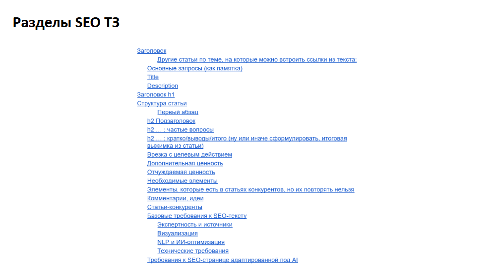 Это разделы, которые есть в моём SEO ТЗ. Его всегда составляет человек, который понимает, какой результат должен получиться, заранее продумывает фактуру, чтобы нейронка работала только с ней.
