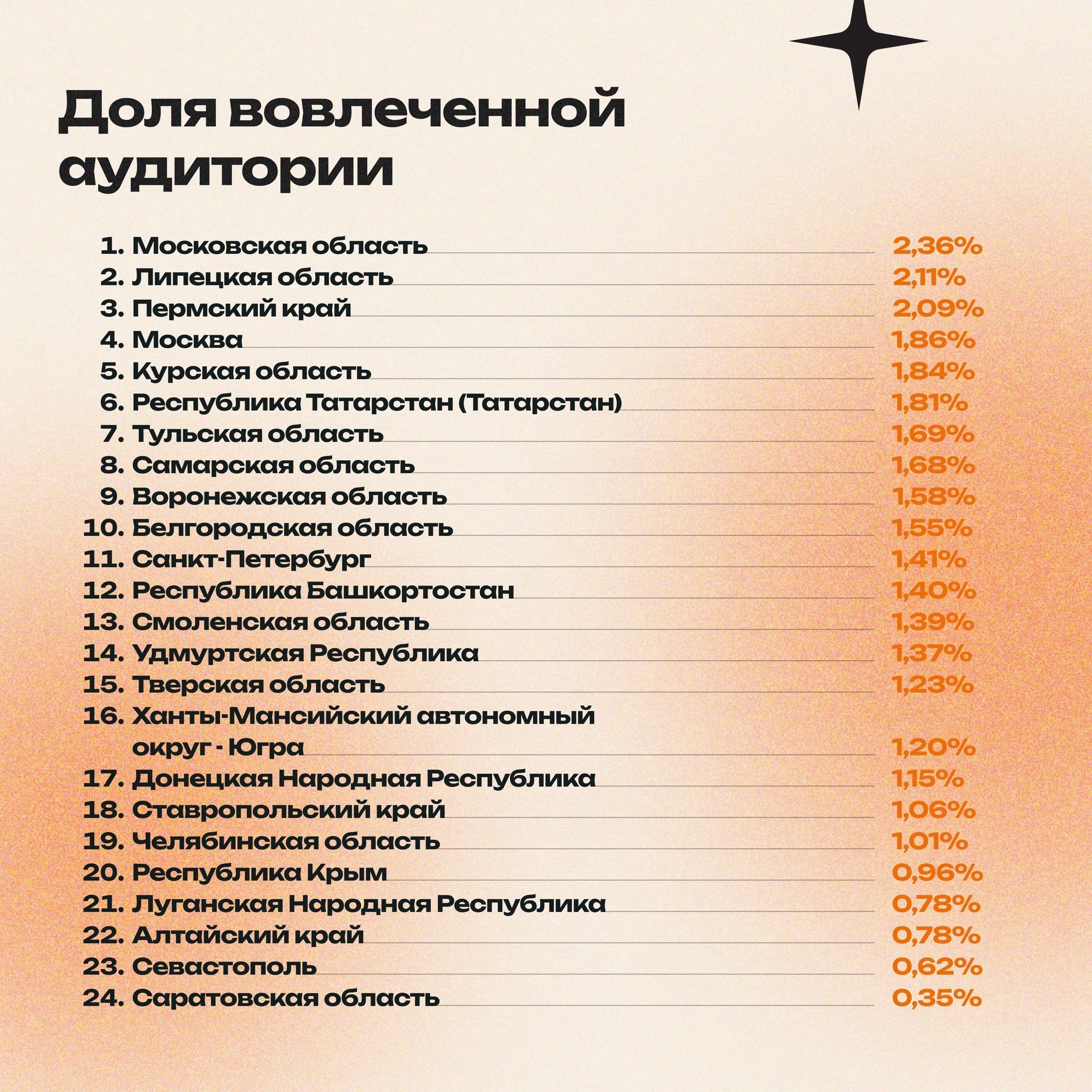 Исследуемые регионы были проранжированы по количеству упоминаний, среднему охвату и степени вовлеченности пользователей, на основе которых выводились результаты.
