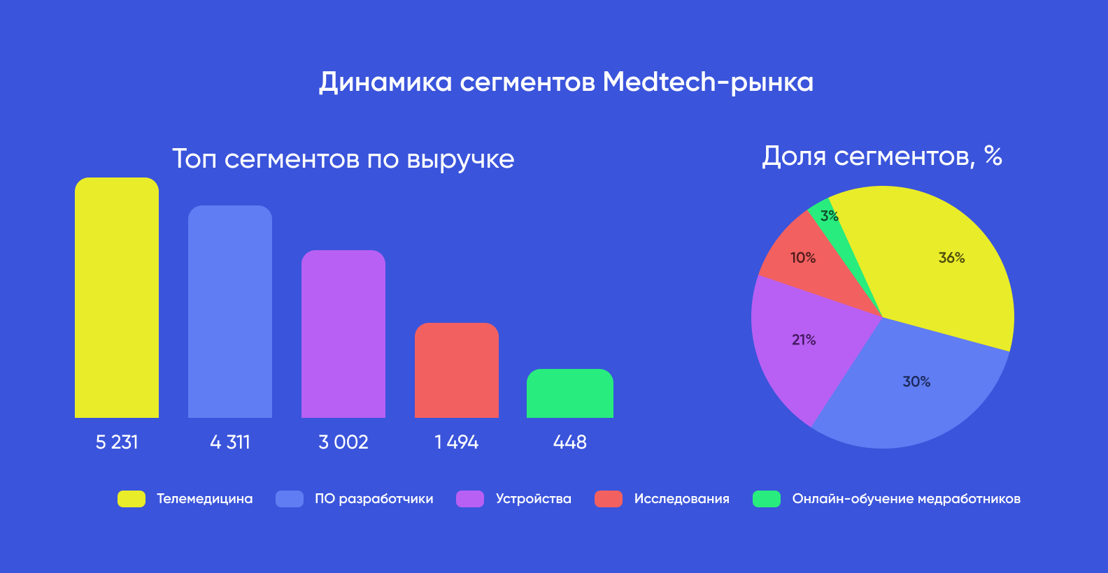 Параллельно значительную долю рынка занимают сегменты программного обеспечения и медицинских устройств. Это подтверждает тренд на интеграцию технологических решений в медицинскую практику — от систем управления клиниками до диагностического оборудования.