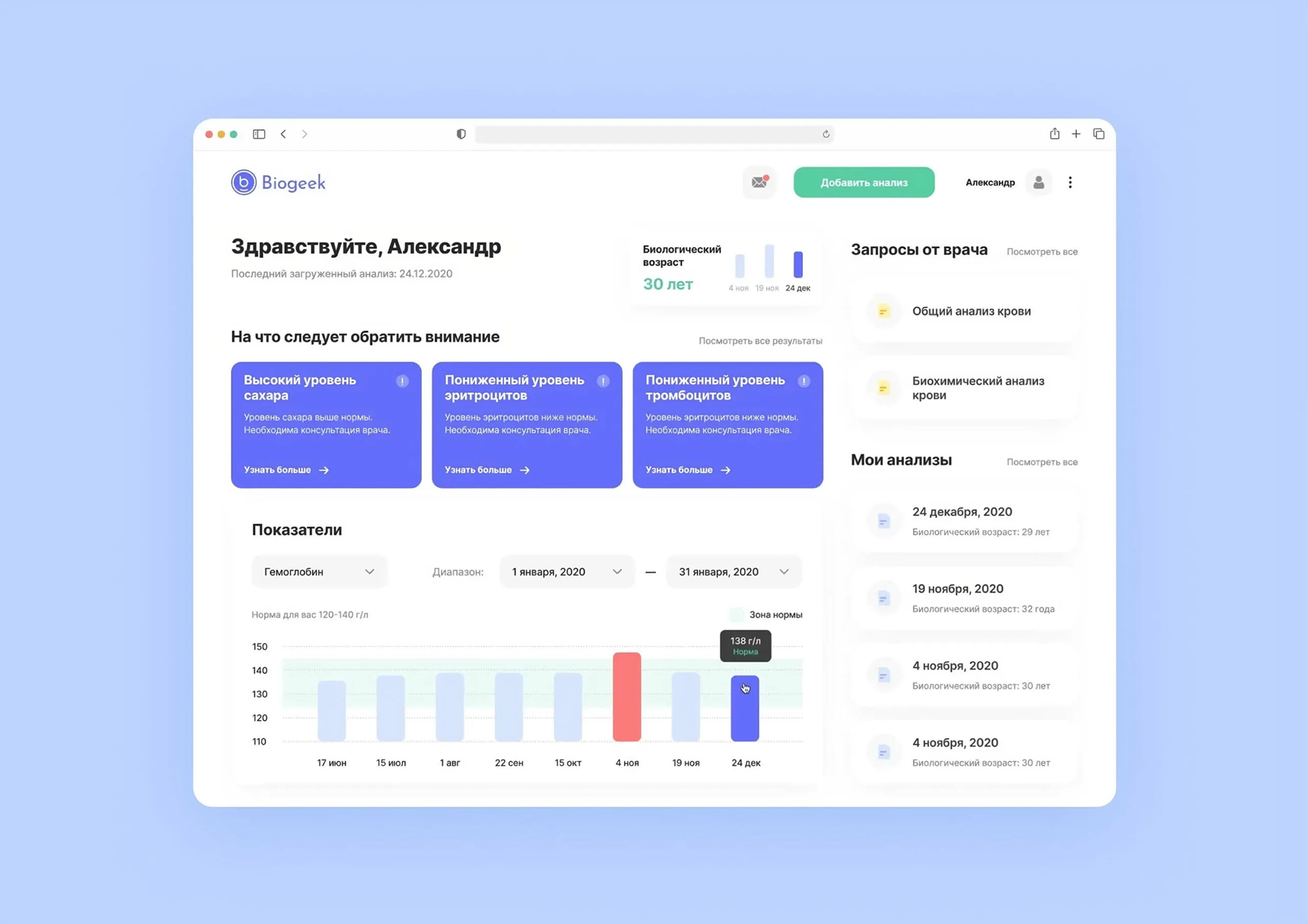 Проект Biogeek появился, когда два основателя — бизнесмен и врач-нутрициолог — заметили, что многие люди заботятся о своем здоровье, но не имеют удобного инструмента для анализа медицинских данных. Они регулярно сдают анализы, но результаты хранятся в разрозненных PDF-файлах, что мешает отслеживать динамику показателей.