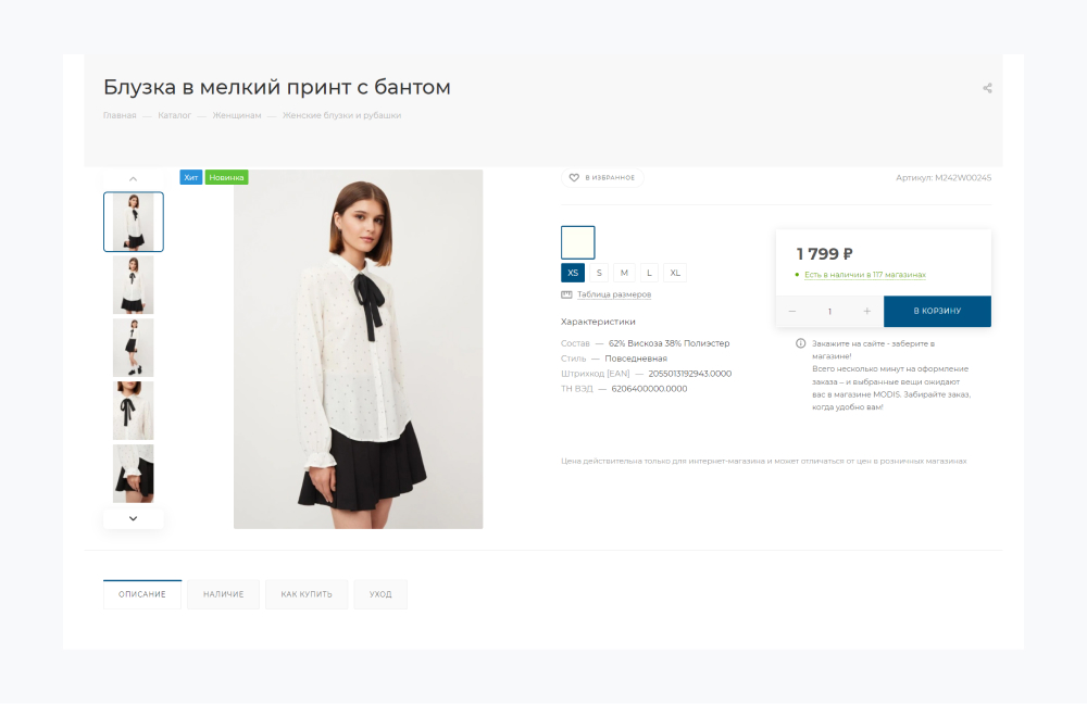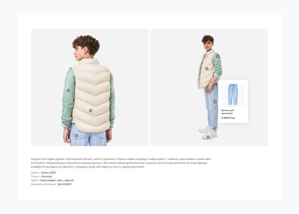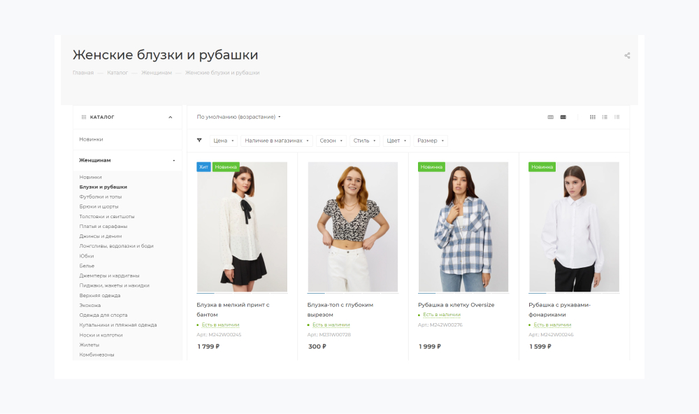 Раздел с готовыми луками помогает покупателям понять, как сочетать вещи. Создавайте тематические коллекции — офисные образы, летние комплекты.